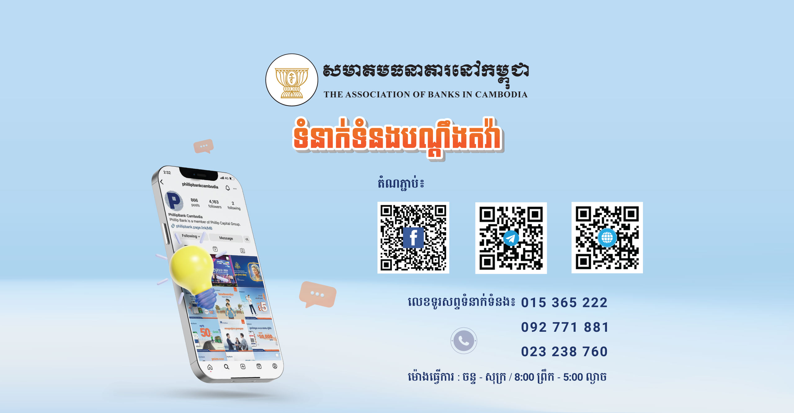 បើសិនលោកអ្នកមានចម្ងល់ ឬបណ្តឹងតវ៉ា ពាក់ព័ន្ធនឹងការប្រើប្រាស់សេវាហិរញ្ញវត្ថុ សូមធ្វើការទំនាក់ទំនង មកសមាគមធនាគារនៅកម្ពុជាតាមរយៈលេខទូរសព្ទ៖ 015 365 222 ឬតាមរយៈអ៊ីម៉ែល៖ abc_cp@abc.org.kh ចាប់ពីថ្ងៃចន្ទ ដល់ថ្ងៃសុក្រ ម៉ោង 8:00 ព្រឹក ដល់ម៉ោង 5:00 ល្ងាច។