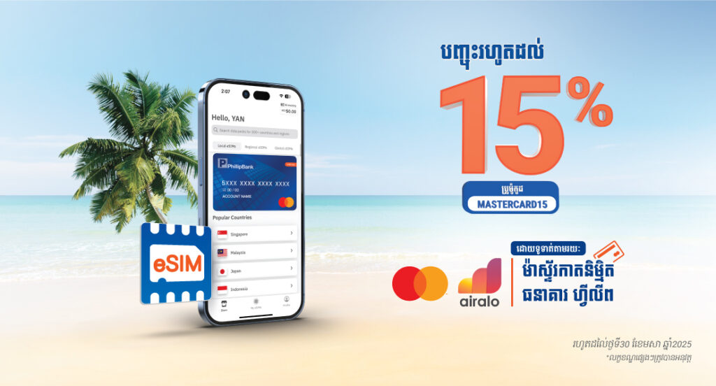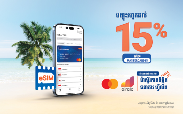 អតិថិជនធនាគារ ហ្វីលីព ទាំងអស់អាចរីករាយជាមួយការបញ្ចុះតម្លៃរហូតដល់ 15% សម្រាប់ការទិញ Airalo eSIM ទាំងអស់នៅលើគេហទំព័រ ឬកម្មវិធីទូរស័ព្ទរបស់ Airalo ហើយធ្វើការទូទាត់ជាមួយ ម៉ាស្ទ័រកាតនិម្មិតធនាគារ ហ្វីលីព។