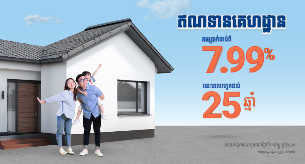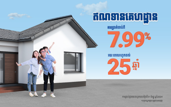 អតិថិជនអាចស្នើសុំឥណទានគេហដ្ឋានធនាគារ ហ្វីលីព ជាមួយអត្រាការប្រាក់ប្រចាំឆ្នាំចាប់ពី 7.99% និងរយៈពេលកម្ចីរហូតដល់25ឆ្នាំ។