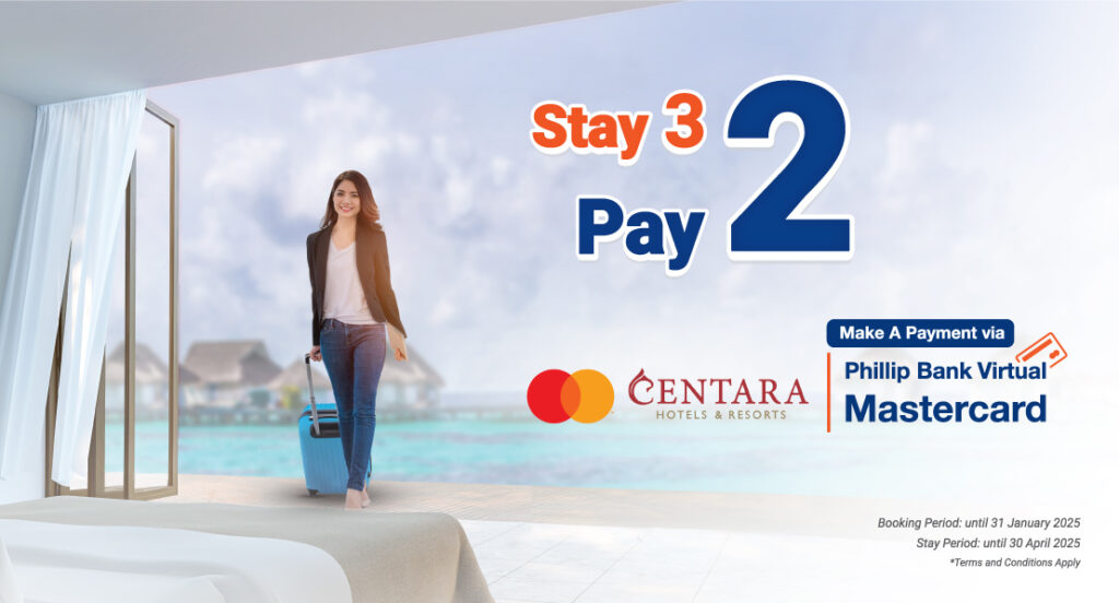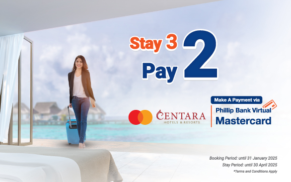 All Phillip Bank customers can enjoy a free one night stay, for every three nights booking at Centara Hotels and Resorts in Thailand and Laos, by just making a payment via Phillip Bank Virtual Mastercard.
