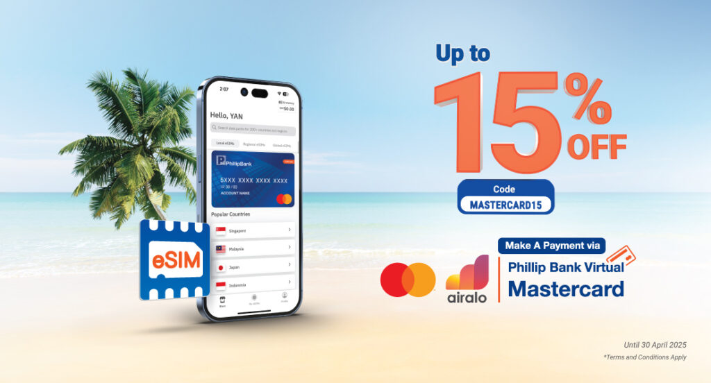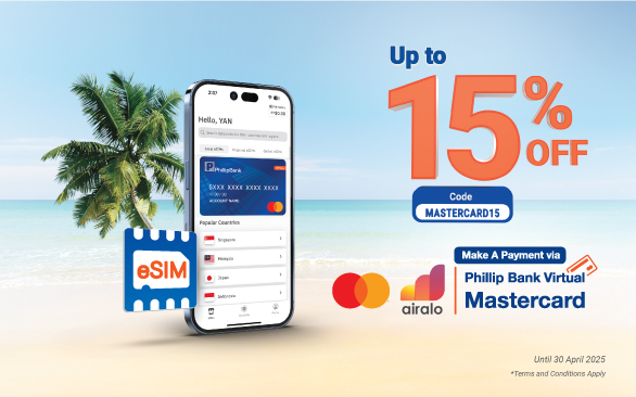 All Phillip Bank customers can enjoy up to 15% OFF for all Airalo eSIMs purchases, on Airalo’s website and app, by making a payment via Phillip Bank Virtual Mastercard.